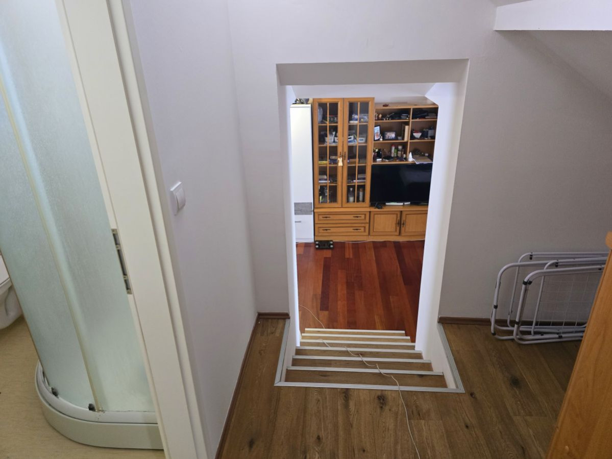 Obnova se ni ustavila le pri zunanjosti – istočasno je bila v celoti prenovljena tudi notranjost stanovanja. Zamenjane so bile vse električne in vodovodne inštalacije, posodobljen sistem ogrevanja, vgrajena nova okna in vrata, položene nove talne obloge ter popolnoma prenovljena kopalnica. Skupni deli stavbe in stanovanje so bili tako tehnično usklajeno obnovljeni v istem obdobju, kar kupcu pomeni manj nepredvidenih stroškov in večjo dolgoročno varnost.