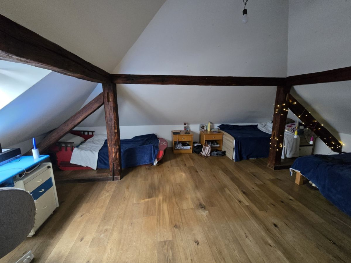 Poseben čar spalnici daje obdelan strop z vidnimi lesenimi tramovi, ki ustvarjajo toplino, občutek domačnosti in pridih rustikalne elegance. Ta detajl prostoru doda karakter in ga loči od klasičnih, ravnih stropov v večini stanovanj.