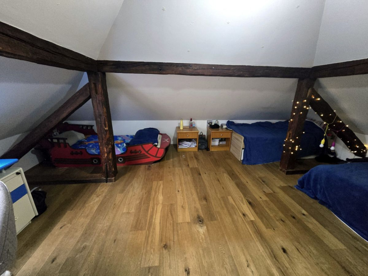 Poseben čar spalnici daje obdelan strop z vidnimi lesenimi tramovi, ki ustvarjajo toplino, občutek domačnosti in pridih rustikalne elegance. Ta detajl prostoru doda karakter in ga loči od klasičnih, ravnih stropov v večini stanovanj.