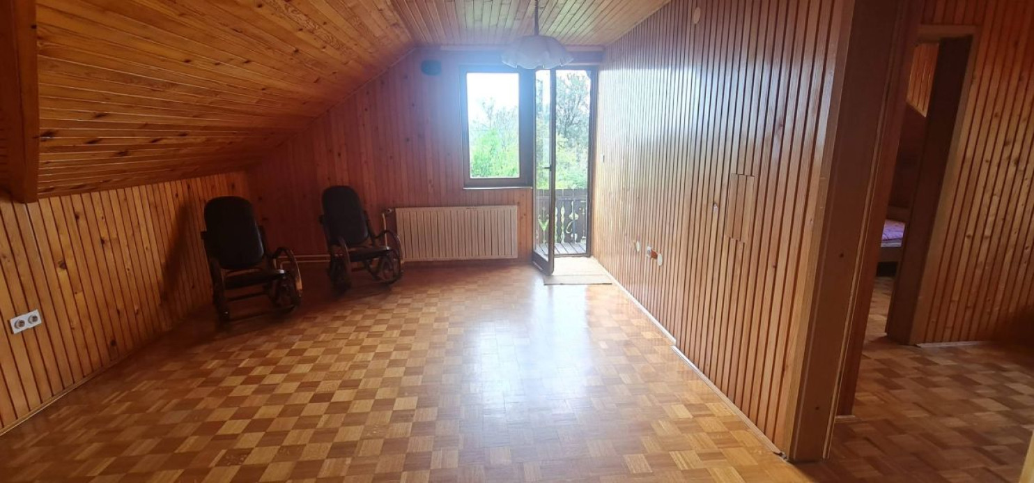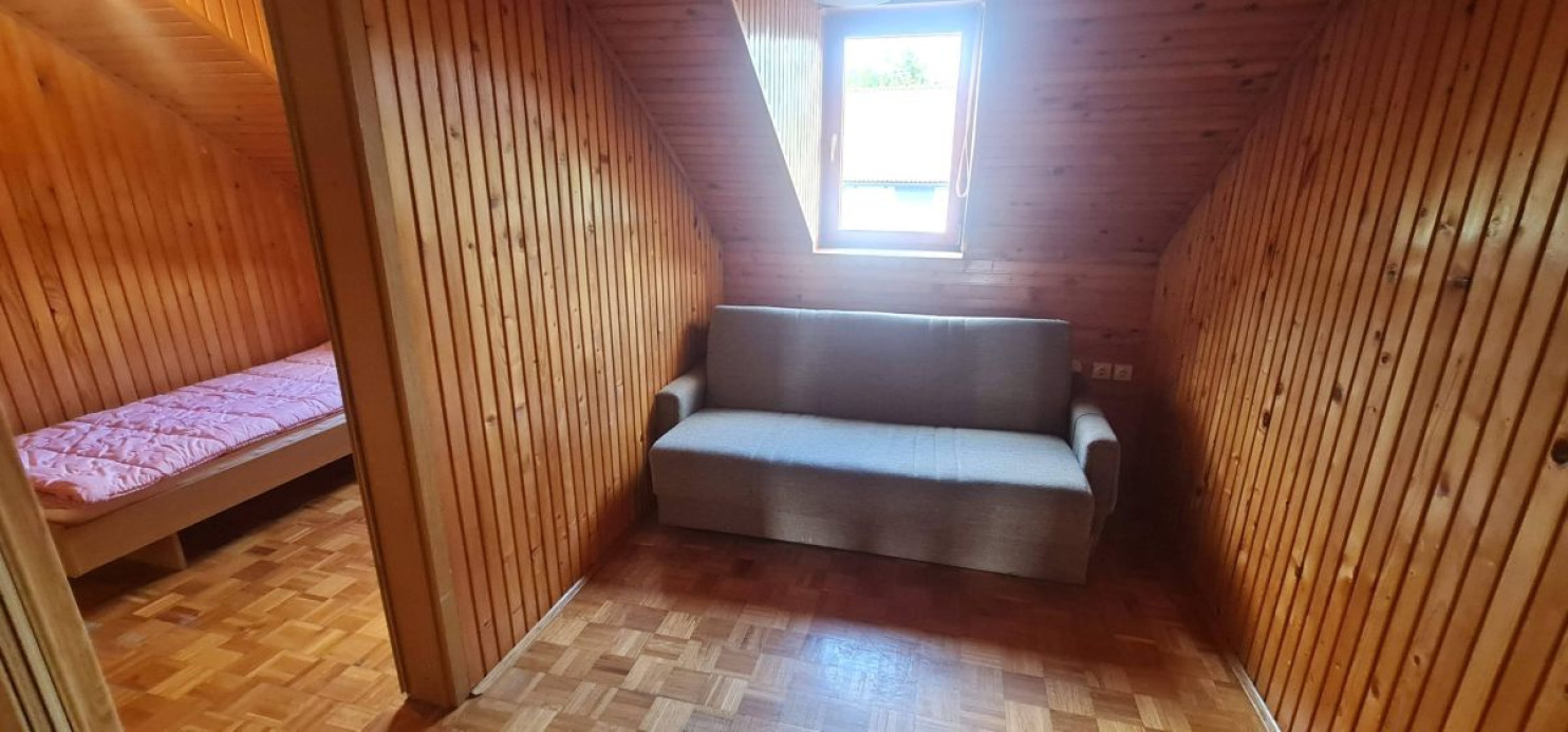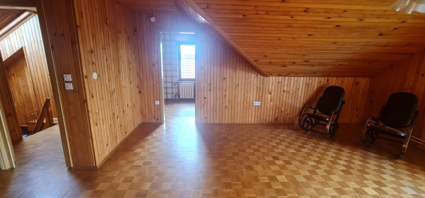 Celotna notranjost mansarde je obdelana z lesom, talna obloga je parket, v kopalnici in sanitarijah je položena keramika, okna pa so lesena z roletami.