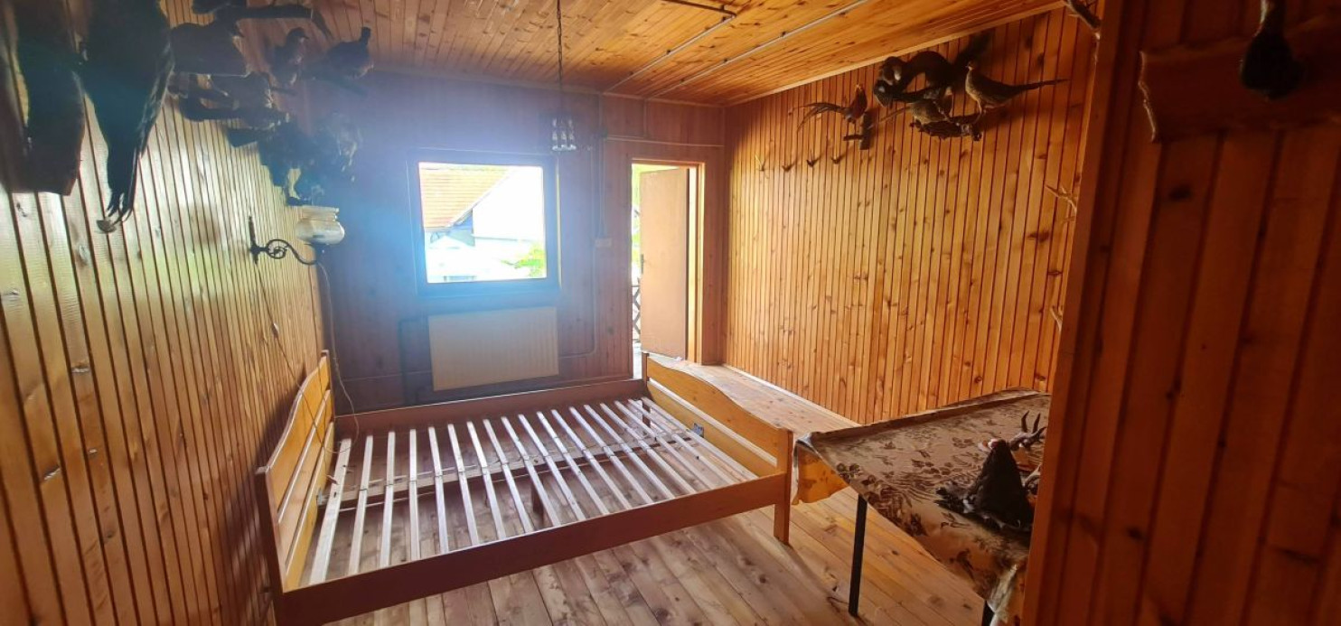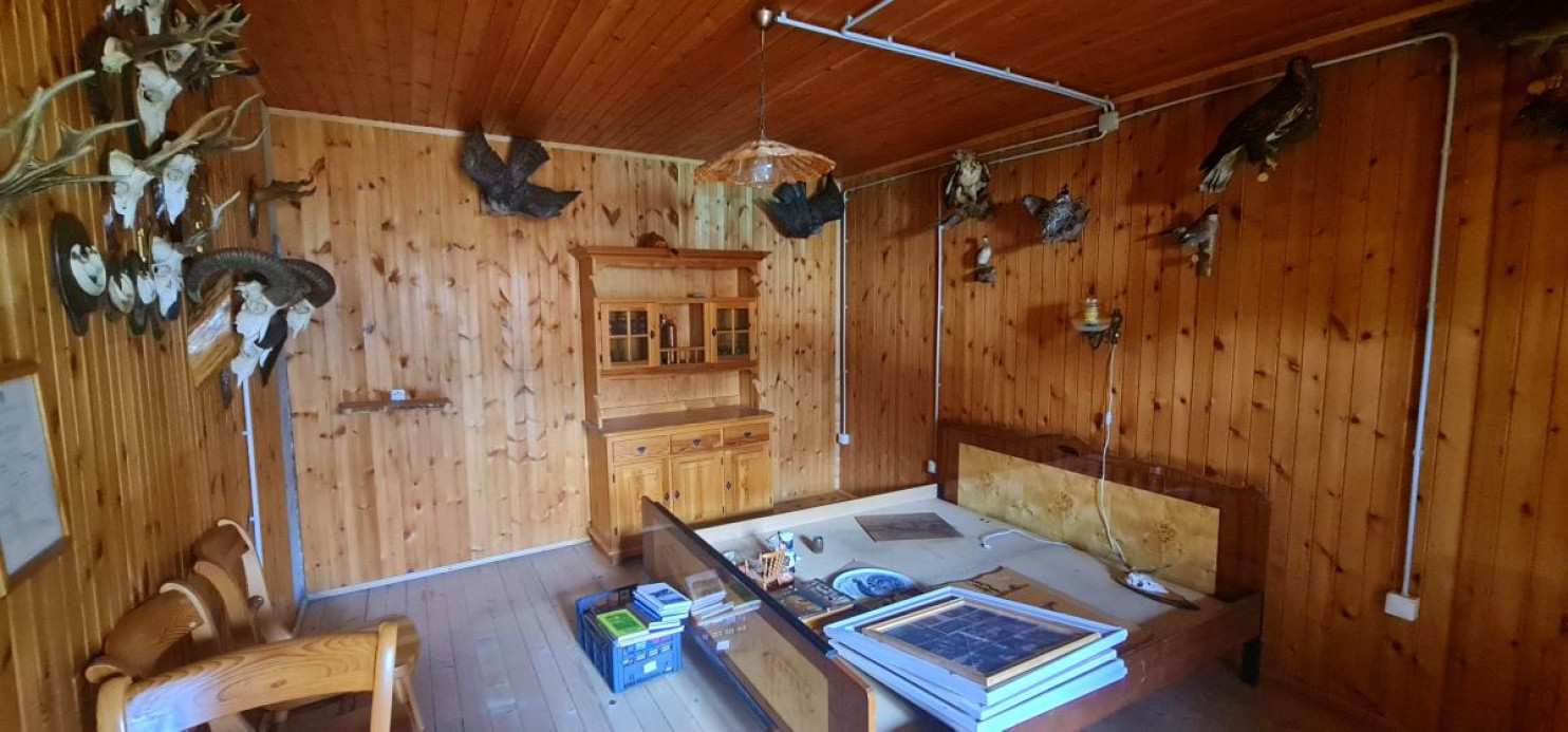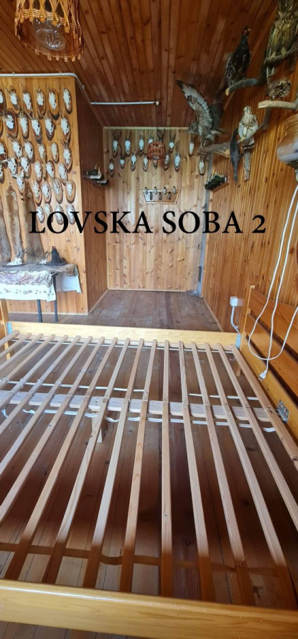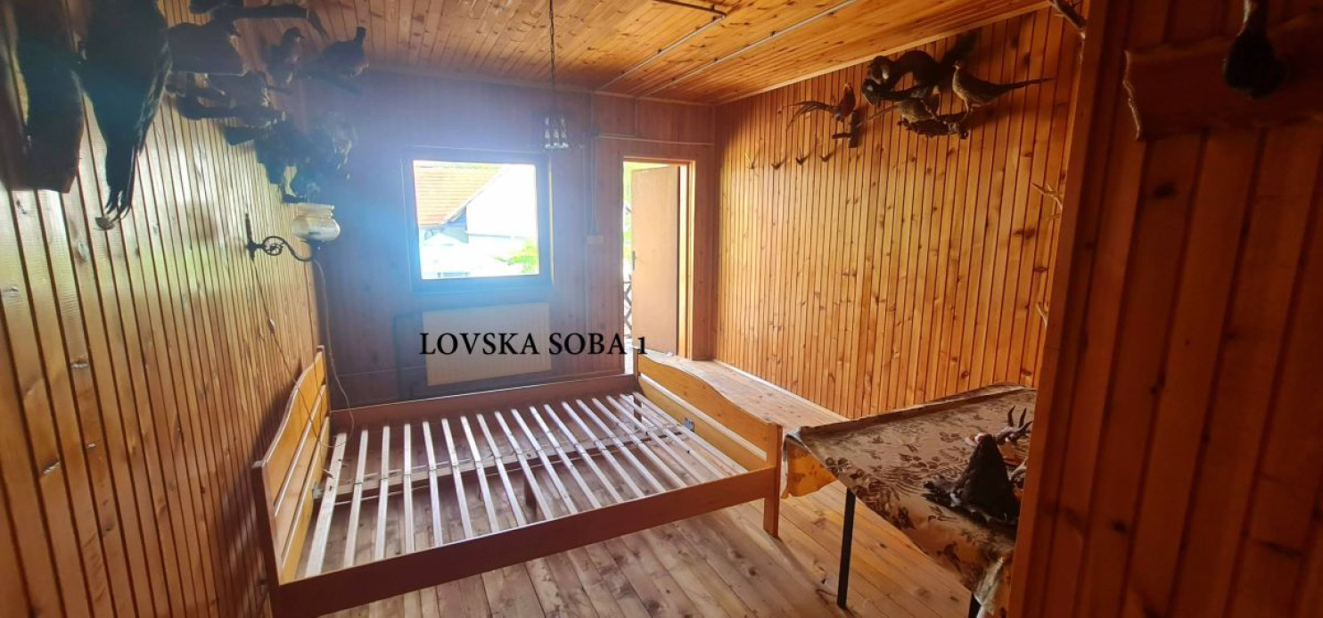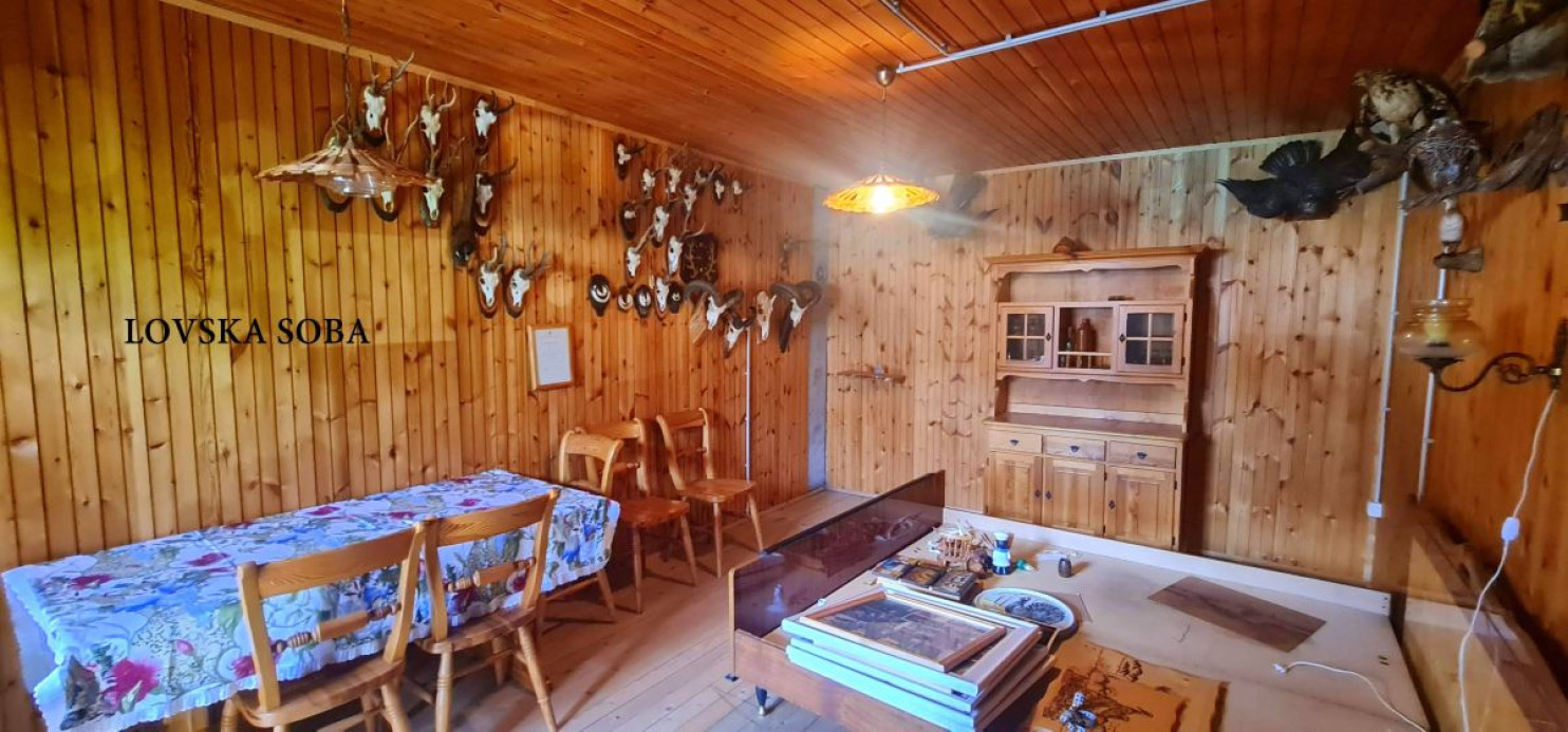 1. pomožni kmetijski objekt je etažnosti P+1, neto tlorisne površine 93,20 m2, grajen leta 1985, v katerem se v pritličju nahajata 2 garaži, letna kuhinja in nadstrešnica, v nadstropju pa 2 lovski sobi in predprostor s kopalnico (tuš, wc), do katerih se dostopa preko zunanjih stopnic in balkona. Zgornji del objekta ima nameščene radiatorje, v eni od spodnjih garaž pa se nahaja peč na kurilno olje in manjši rezervoar. Strešna kritina na tem objektu je iz salonitnih plošč.