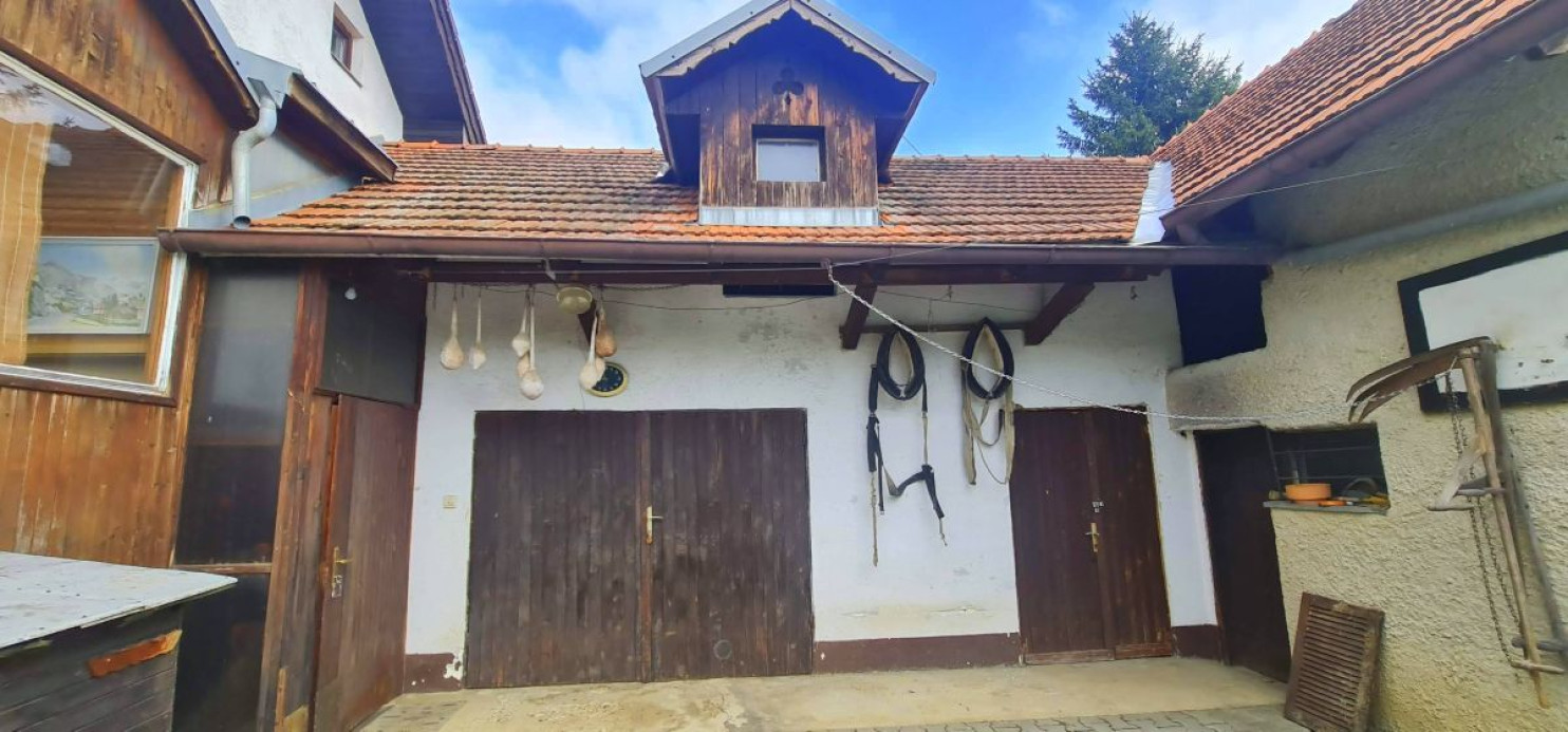V nadaljevanju hiše se razprostira gospodarsko poslopje, neto tlorisne površine 70,30 m2, grajeno leta 1980, z garažo, večnamenskimi prostori in hlevi z opečnato kritino.